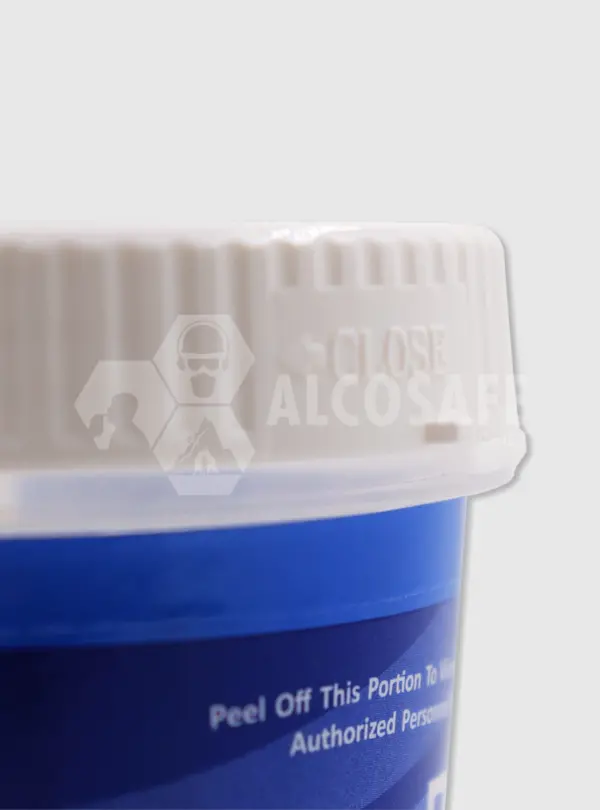 - Después de que el donante haya depositado la muestra en la copa, coloque y ajuste firmemente la tapa. La copa cuenta con un indicador de cierre de la tapa. Cuando las pestañas indicadas estén alineadas, la copa estará completamente sellada.